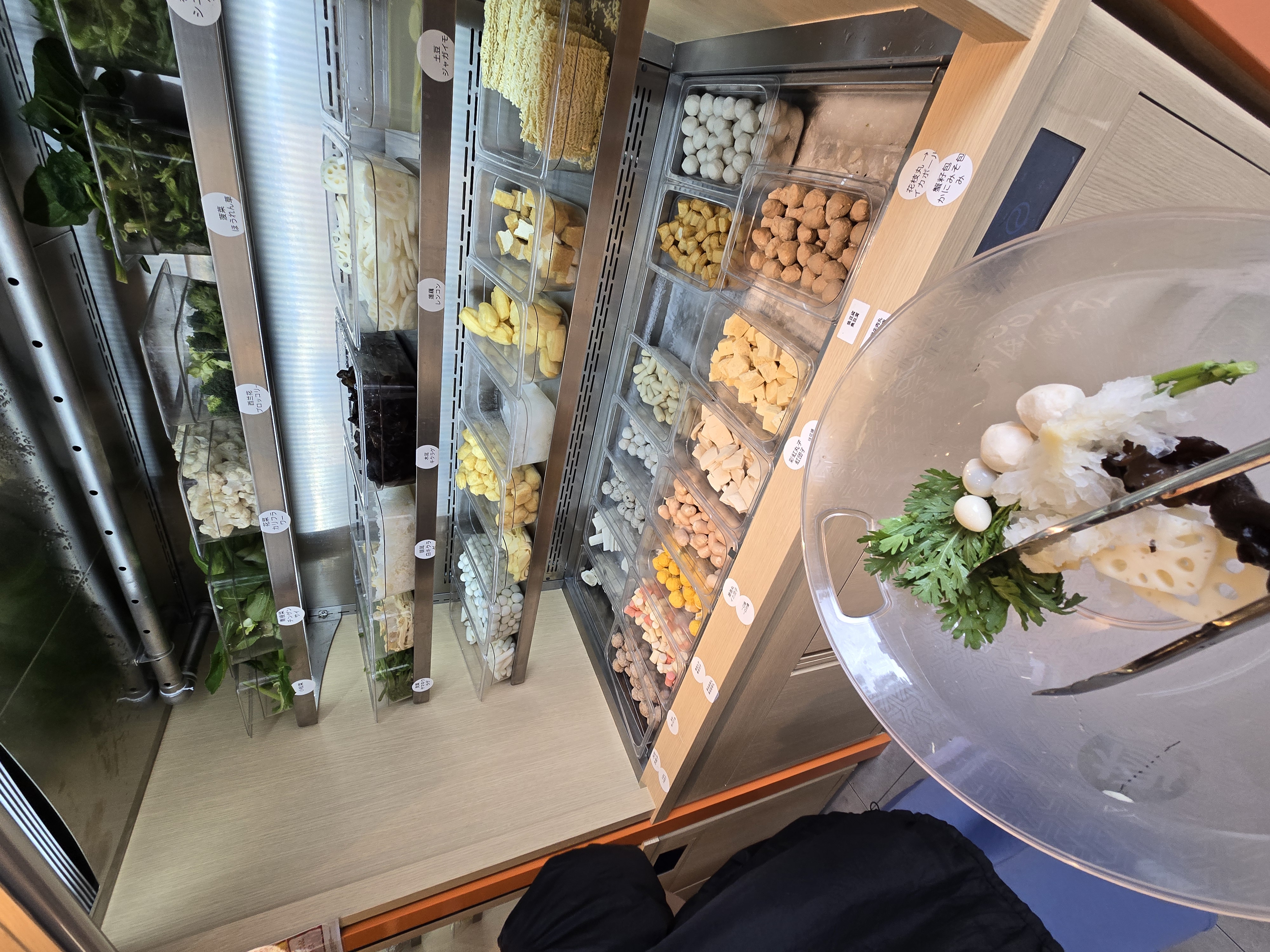 店内に入ると、ずらりと並んだ新鮮な野菜やお肉、海鮮団子などが目に飛び込んできます。 野菜不足解消にほうれん草やキクラゲを多めにしたり、お気に入りの練り物を入れたりと、その日の気分でカスタマイズできるのが最大の魅力ですね。