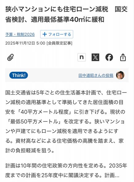 先日、日経新聞で「住宅ローン控除の面積要件を40㎡程度へ緩和する方向で国交省が検討している」という報道がありました。